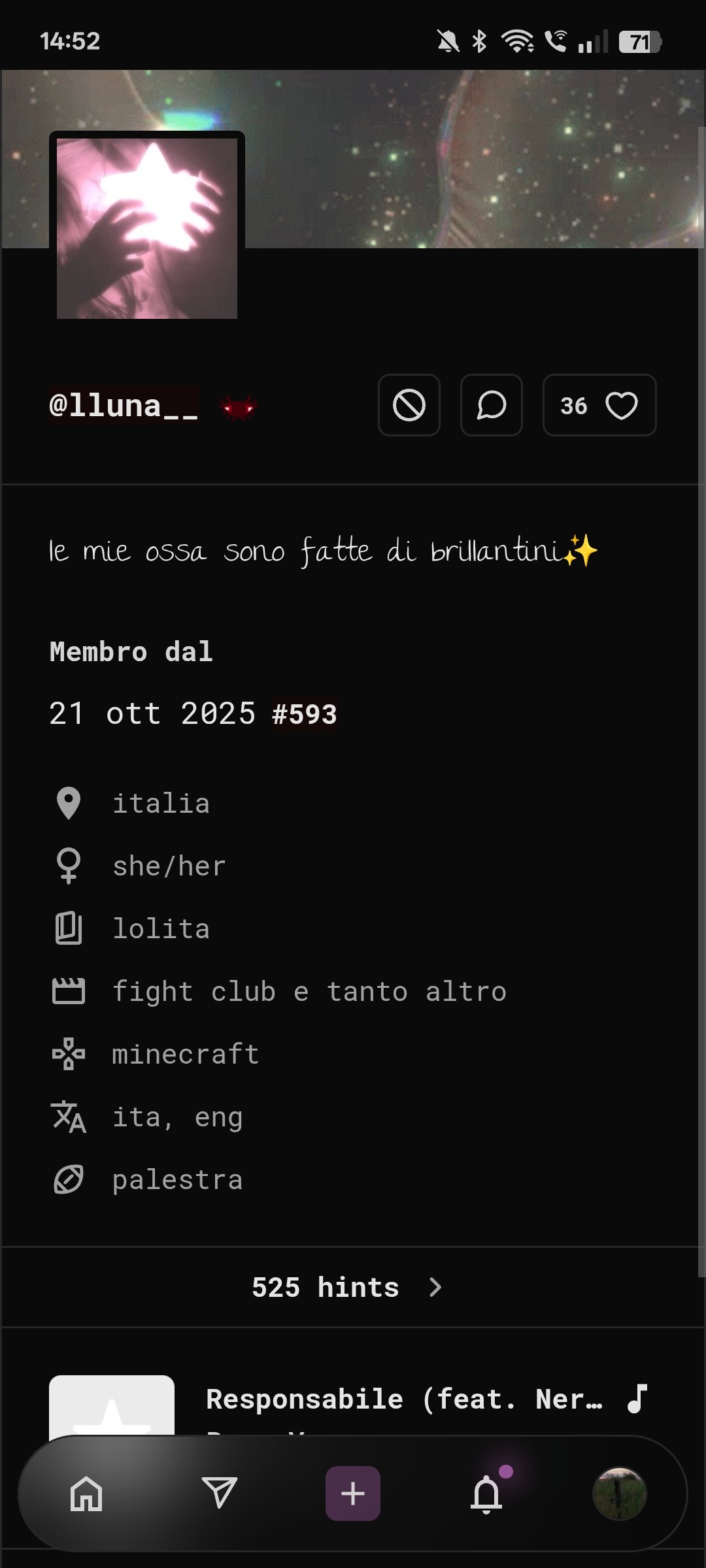 vabbè te sei qualche volta di troppo. Comunque lei usa hint come diario ma non interagisce con nessuno e blocca a vista quelli che gli stanno in culo. Boh vabb