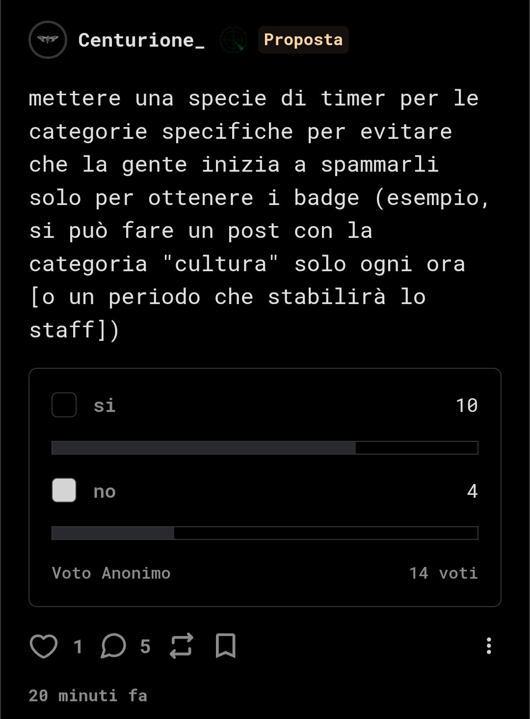 mettere una specie di timer per le categorie specifiche per evitare che la gente inizia a spammarli solo per ottenere i badge (esempio, si può fare un post con la categoria "cultura" solo ogni ora [o un periodo che stabilirà lo staff])