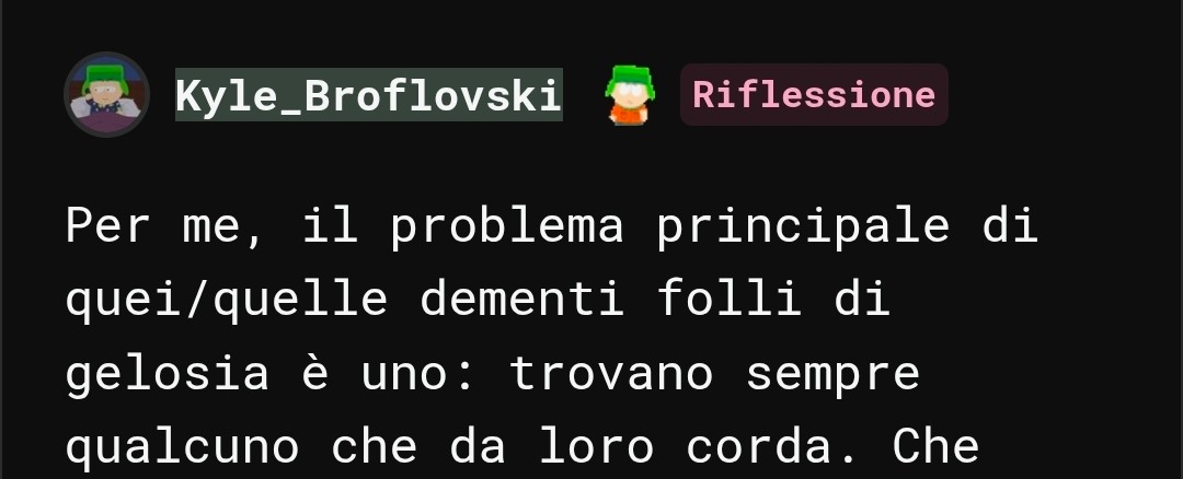 Per me, il problema principale di quei/quelle dementi folli di gelosia è uno: trovano sempre qualcuno che da loro corda. Che siano genitori, fidanzate/i o amiche/i, loro trovano sempre alleati. È in questo senso che dovrebbe andare l'educazione: isolare o aiutare seriamente, senza assecondarli, esti soggetti. Da questo punto di vista siamo messi male, perché tutti ti mettono in guardia su questo genere di predatori, ti spiegano i segnali per riconoscerlo ma non basta.