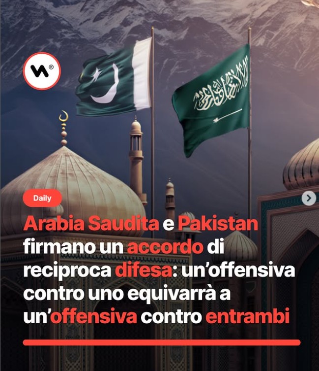 L'Arabia si para il culo per evitare attacchi da parte di Israele, soprattutto dopo aver visto che Israele ha attaccato il Qatar pur andando contro gli ordini degli USA. Questi minacciano la Cina anche, attaccano il Qatar. L'India, così facendo, non attaccherà mai più il Pakistan, non avrebbe senso, ed Israele ci pensa 165 volte prima di attaccare l'Arabia.