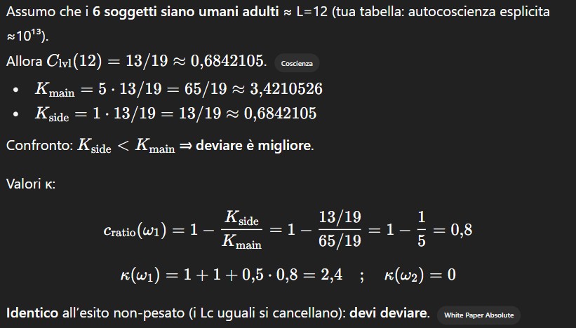 - c_ratio(ω)=∣ΔV∣/V_max: scarto dall’“optimum logico” sul danno (vite innocenti perse o, nella versione estesa, unità di danno equivalente ΔE).