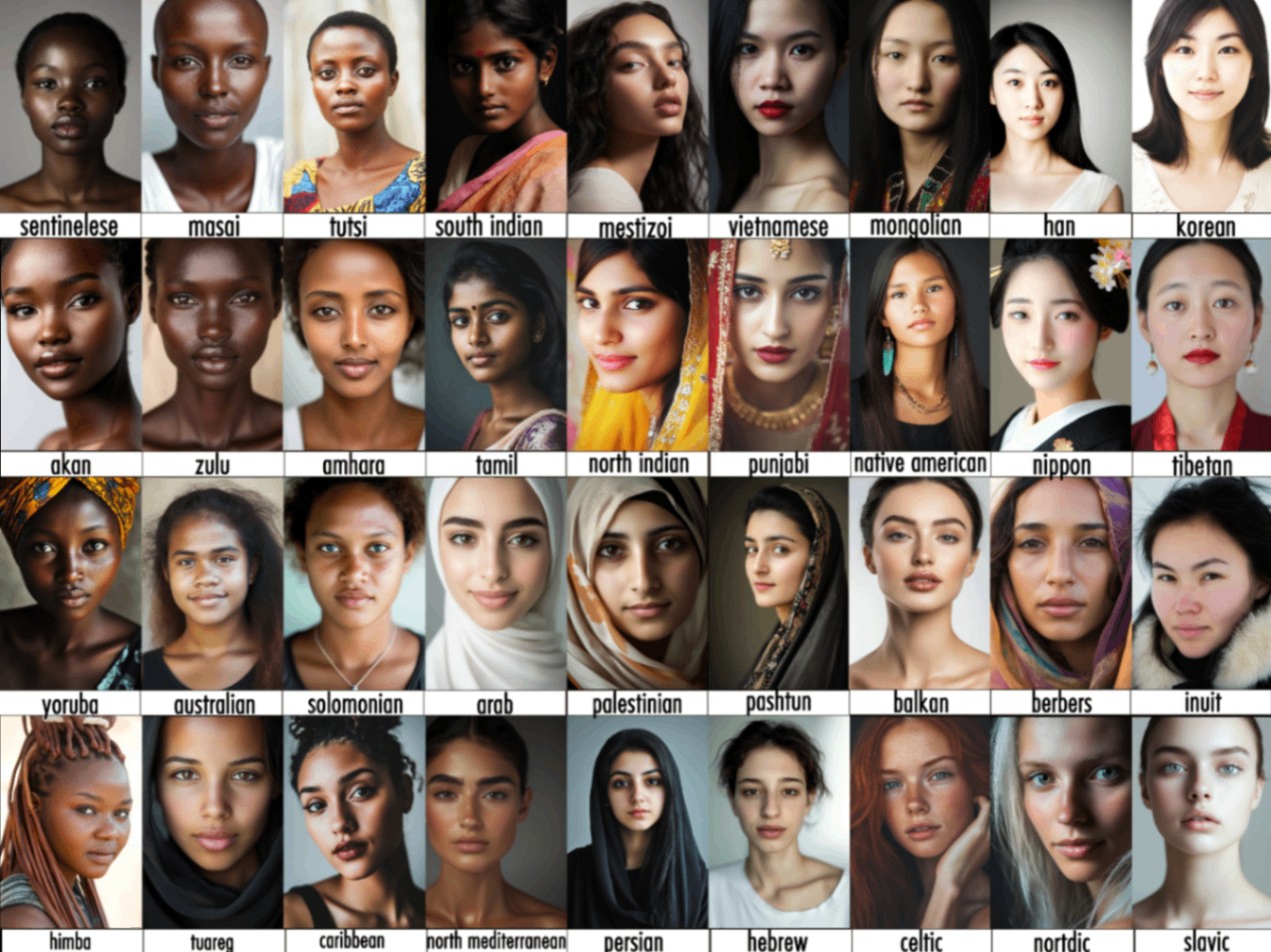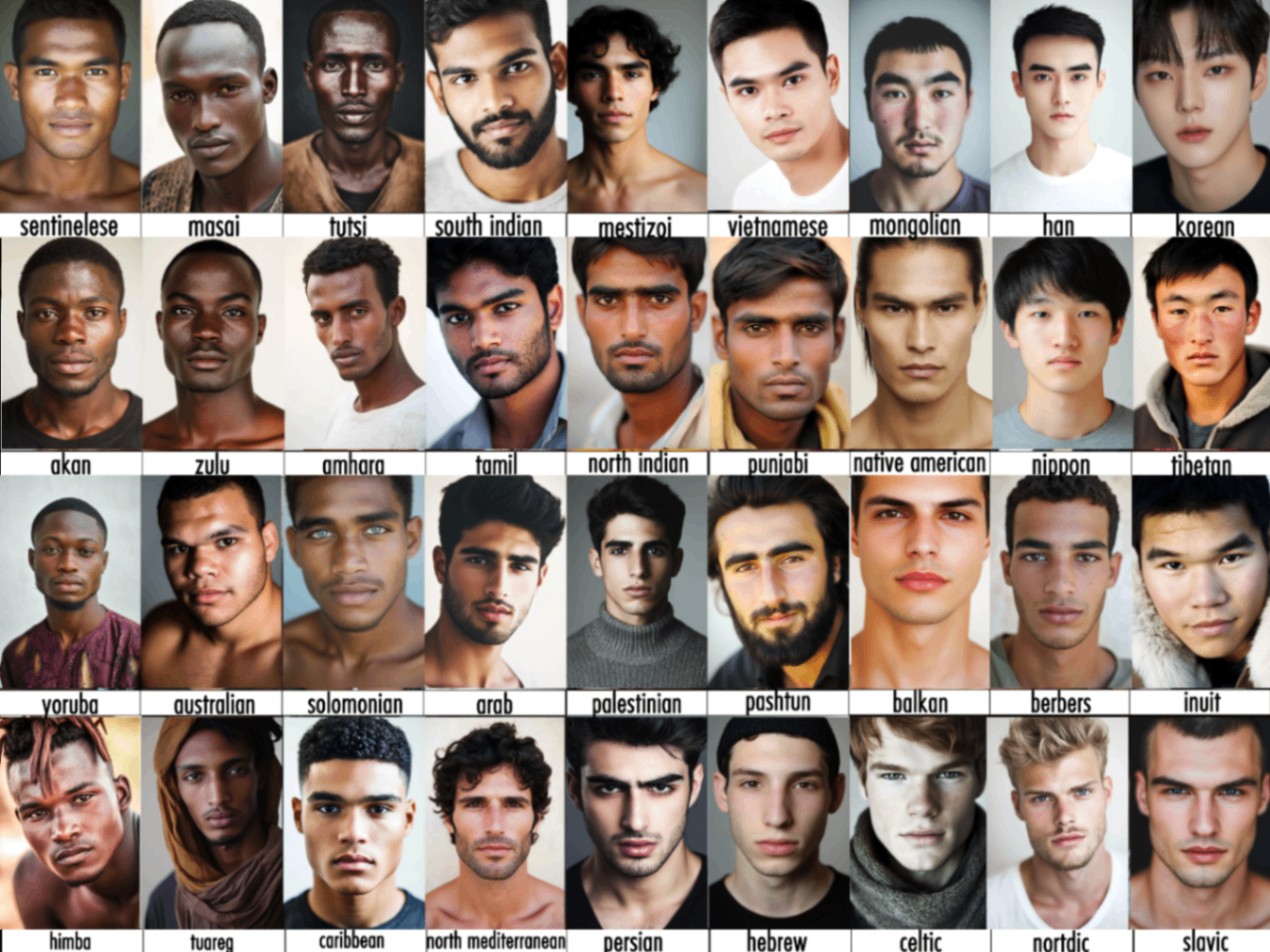 Come vedete non è solo un aspetto fisico, ma proprio culturale. Vedete la differenza nell'abito tra il punjabi e il nord india? Oppure gli Himba che sono fantastici, hanno dei capelli che creano così artificialmente perché l'essere umano si "modifica" attraverso la sua stessa cultura. La differenza del velo tra araba e pashtun e berbera.Ah si... l'obbiettivo era anche avere il viso più bello esteticamente, in modo oggettivo. Poi ci sono degli standard di bellezza occidentali in cui che ne so... il "Nordic" edete che ha un aspetto molto ammaliante? Ebbene... se foste in corea il ragazzo coreano in alto a destra sarebbe super figo. Per gli italiani trovate in basso, il quarto da sinitra.