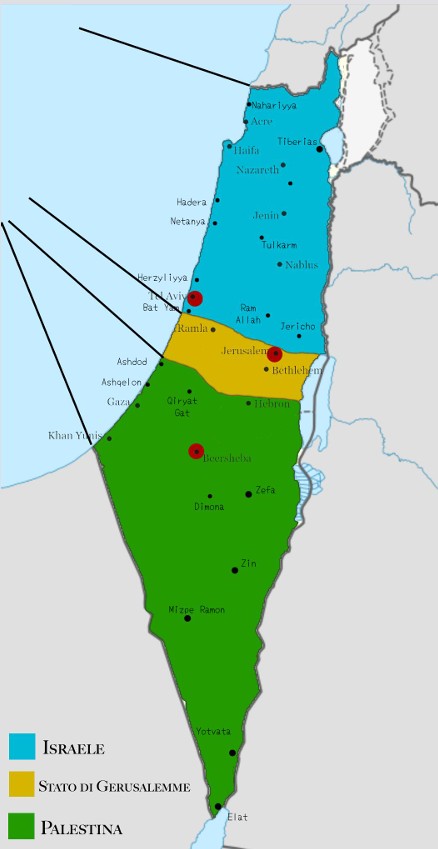 Il territorio è diviso in 3 parti. Lo Stato di Israele, lo Stato di Palestina e lo Stato di Gerusalemme.