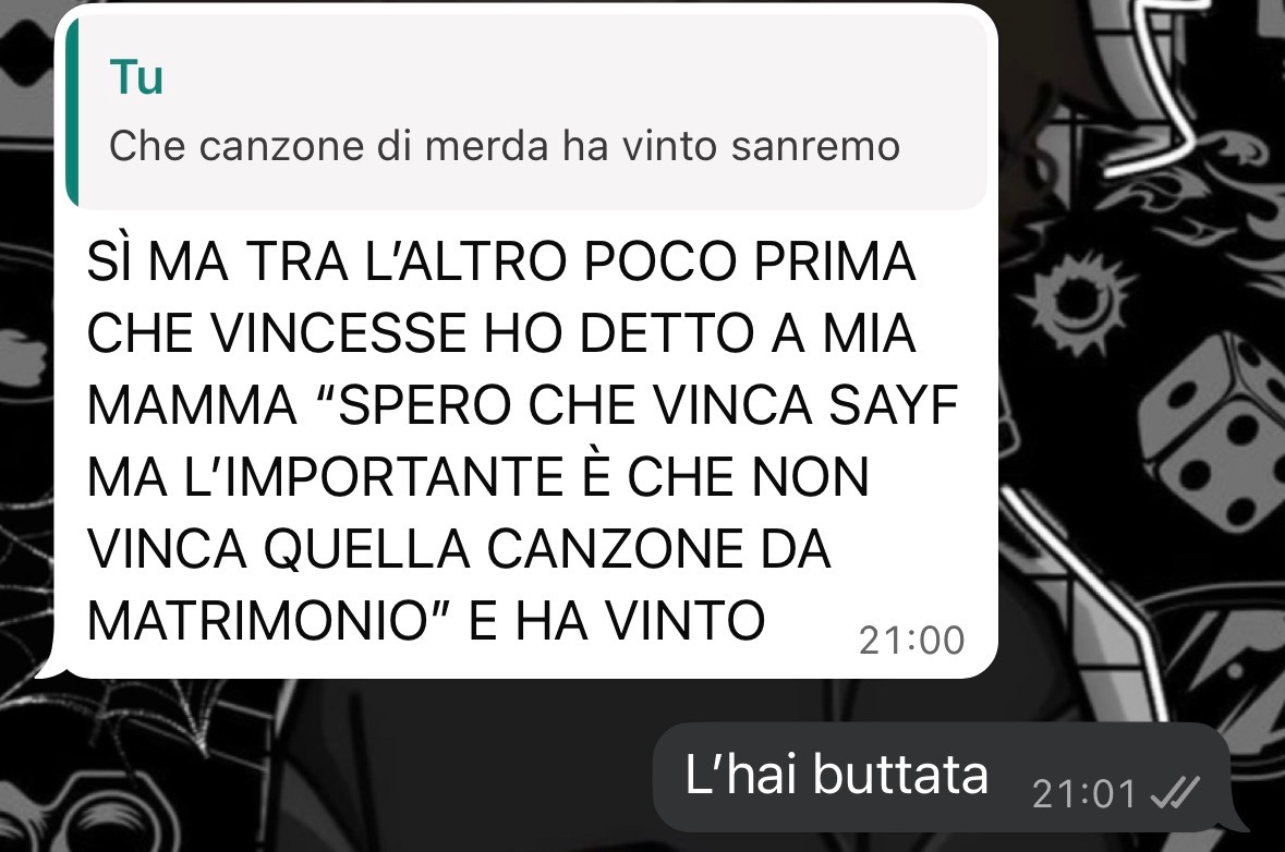 Sopravvissuto a quel compleanno madonna che rottura di palle poi non c’era un cazzo di segnale a una certa l’iphone mi ha mandato delle notifiche tipo “collega la tua posizione al satellite” boh pensava mi fossi disperso