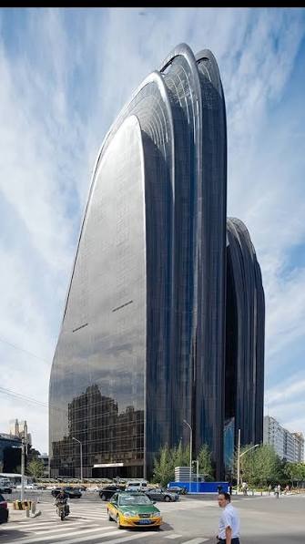 Il complesso sorge in uno dei più importanti distretti produttivi di Pechino. Due grandi grattacieli neri si ergono sull'intera area. Non so voi, ma a me ricorda molto una cozza gigante, anche se nell'idea dell'architetto c'era quella di montagne e valli artificiali, nel contesto dinamico di una cittadella industriale.