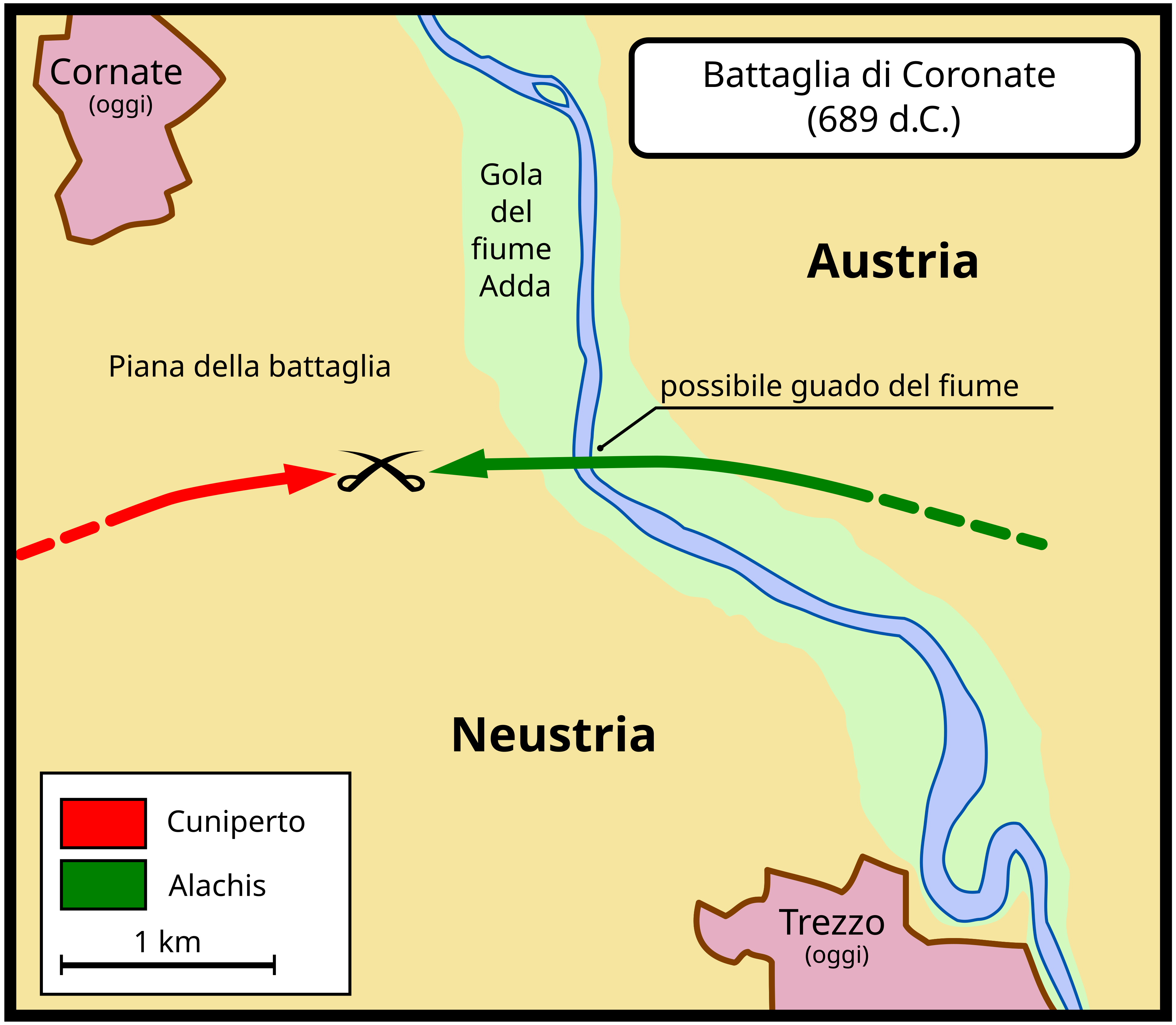 Mappa della Battaglia di Coronate, svoltasi sulla piana tra Coronate e Trezzo sull'Adda, nei pressi del fiume Adda.