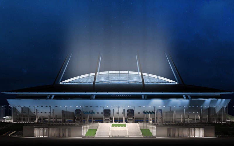 Costruito per i mondiali di calcio del 2018, lo stadio di San Pietroburgo ha una copertura mobile, circondata da travi a sbalzo verso il cielo. Più che uno stadio sembra una grossa astronave. Linee pulite e un design semplice, basato interamente sulla funzionalità.