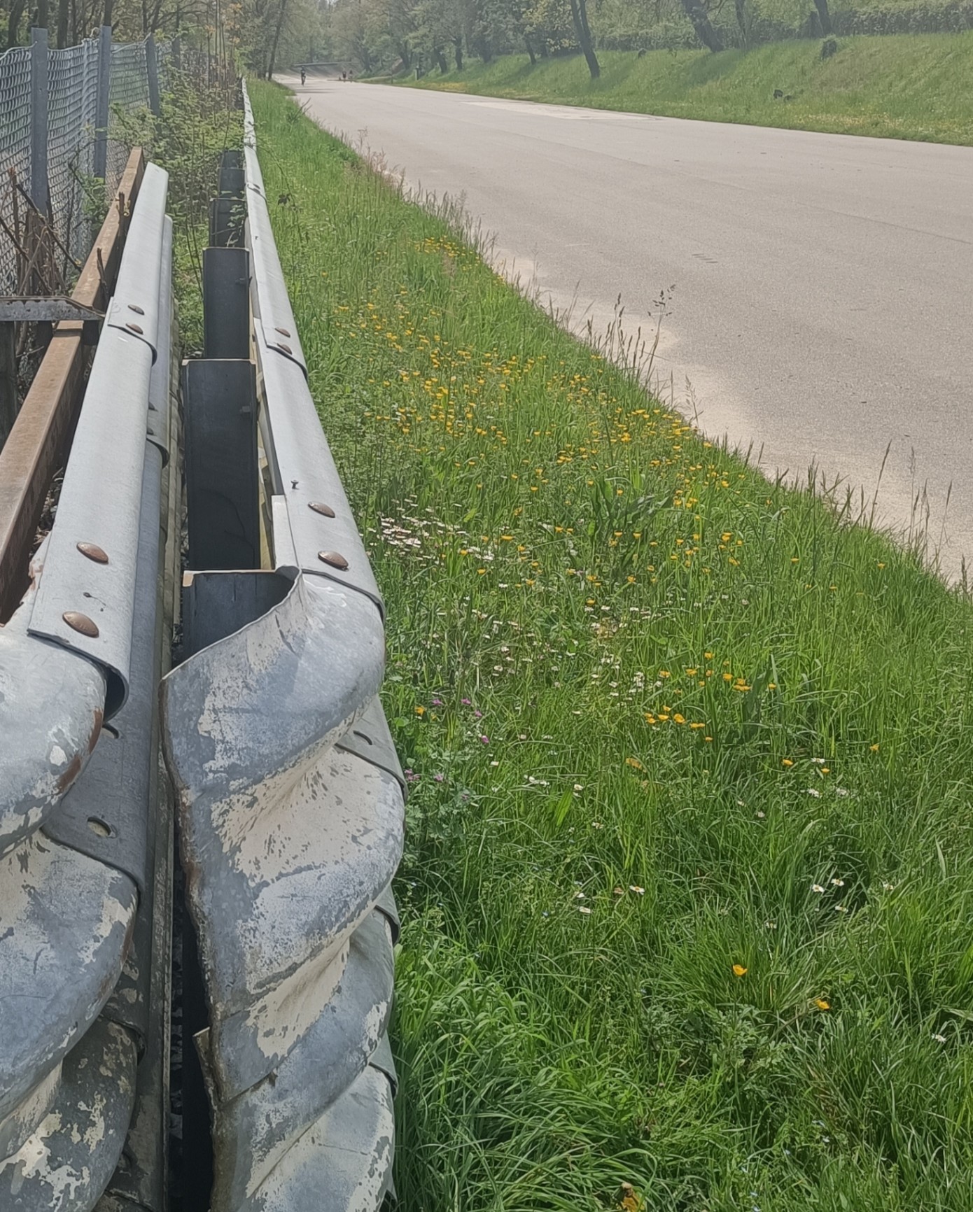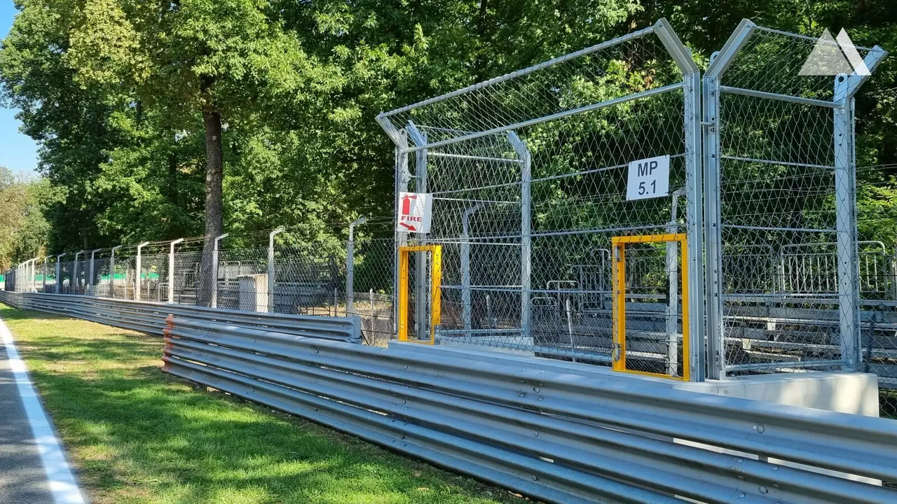 Seguendo invece la sopraelevata, poco più avanti c'è una salita nel prato interno. Affacciandosi al cancello ci troviamo all'esterno della Parabolica, dove in origine il tracciato proseguiva alle curve in Porfido, di cui rimane soltanto questo pezzetto di rettilineo in ingresso curva.
