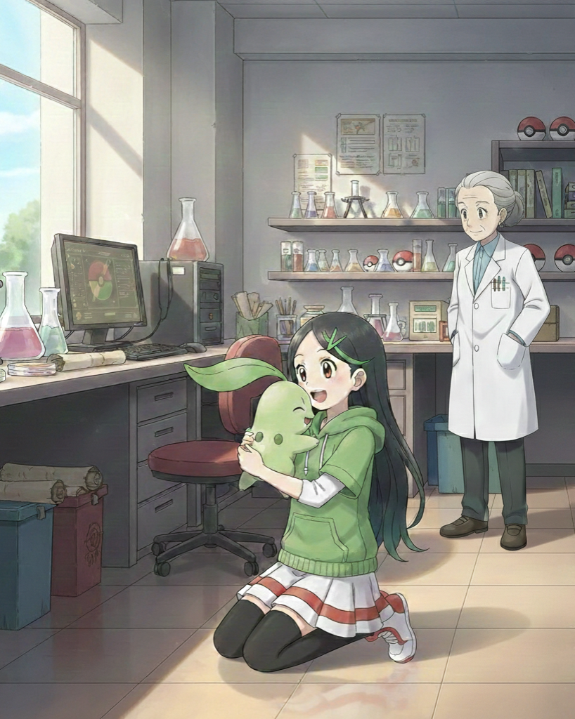 Osservai attentamente le sfere e mi avvicinai alla terza. La professoressa Amelia osservò con attenzione e disse: "pensa bene, è una scelta importante". Presi la sfera e risposi: "ho avuto tanto tempo per pensarci, voglio iniziare con un tipo erba". Il Professor Elm sorrise e disse: "hai fatto una scelta ragionata, dunque vuoi Chikorita?". Presi la sfera e abbracci la nonna. La conversione si interruppe con un suono proveniente dal PC, Elm andò a leggere, mentre nonna Amelia si avvicinò e mi sussurrò nell'orecchio: hai fatto una scelta coraggiosa, complimenti. Nel frattempo appoggiai la sfera sul tavolo e con mia grande sorpresa questa si aprì.