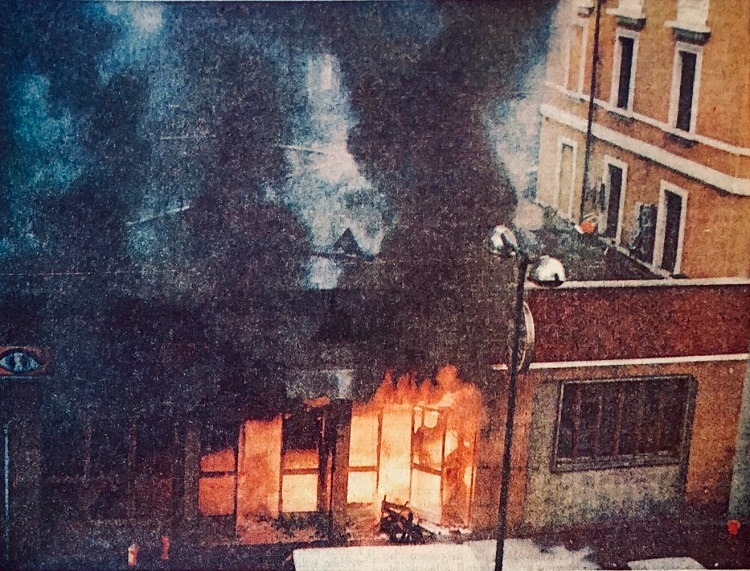 Nel 1983 fu teatro del più grave attentato nella storia della città dopo Piazza Fontana. Era il 14 maggio 1983, quando l'edificio, con arredi in legno, fu rapidamente avvolto dalle fiamme, appiccate da un gruppo neonazista chiamato Ludwig.