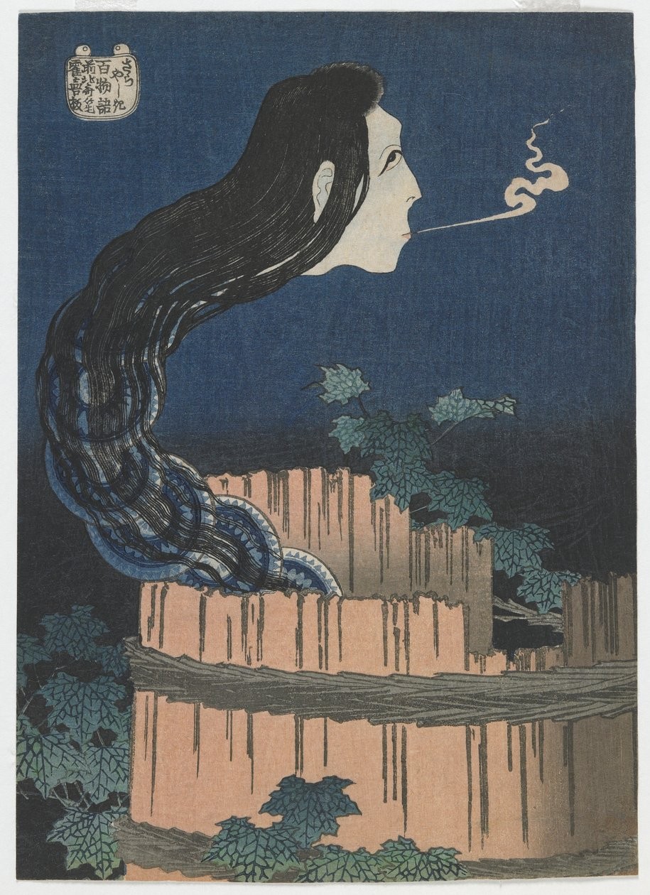 Il suo nome è, o meglio era, Okiku. Circolano diverse versioni di questa storia, ma il racconto più antico e più vicino all'originale è il Banchō Sarayashiki (Il palazzo dei piatti a Banchō). Nel Giappone feudale del XVIII secolo viveva una bella e giovane serva, Okiku appunto, che per caso scoprì un complotto contro il suo padrone. Asayama, il capo delle guardie, autore della congiura, riuscì a cavarsela e preparò la vendetta. Egli fece sparire uno dei dieci preziosi piatti che la ragazza aveva il compito di custodire, per poi darle la colpa. In questi casi la pena per il furto era la morte, così Okiku fu affidata proprio ad Asayama. Dopo averla torturata e umiliata lui la uccise e gettò in un pozzo. In Giappone, ma questa è una credenza diffusa ovunque nel mondo, i morti inquieti in cerca di vendetta tornano come fantasmi. Infatti, nel pieno della notte lo spettro di Okiku emergeva dal pozzo e contava fino a nove, poi scoppiava in un pianto disperato. Chiamato dal signore del castello, un monaco capì che la ragazza cercava ancora il decimo piatto e una notte, appena ebbe contato fino a nove, le grido "Dieci". Allora lo spirito si inchinò e svanì. Ancora oggi al castello di Himeji è possibile ammirare il pozzo di Okiku.